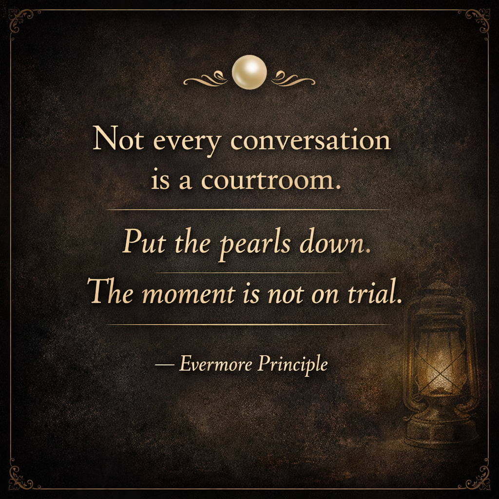 The invitation in Evermore is to “put the pearls down.” To step out of defensiveness, release the need to explain every detail, and respond with calm clarity instead.